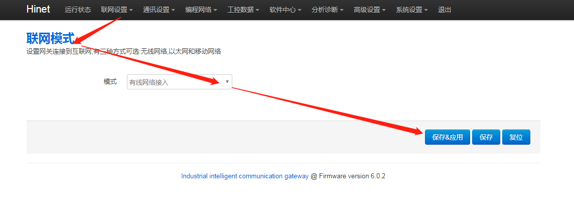 1. 网关后台联网模式是否正确,进网关后台,点击“联网设置 - 联网模式”,修改模式为“有线网络接入”,再点击【保存应用】,重启网关生效。