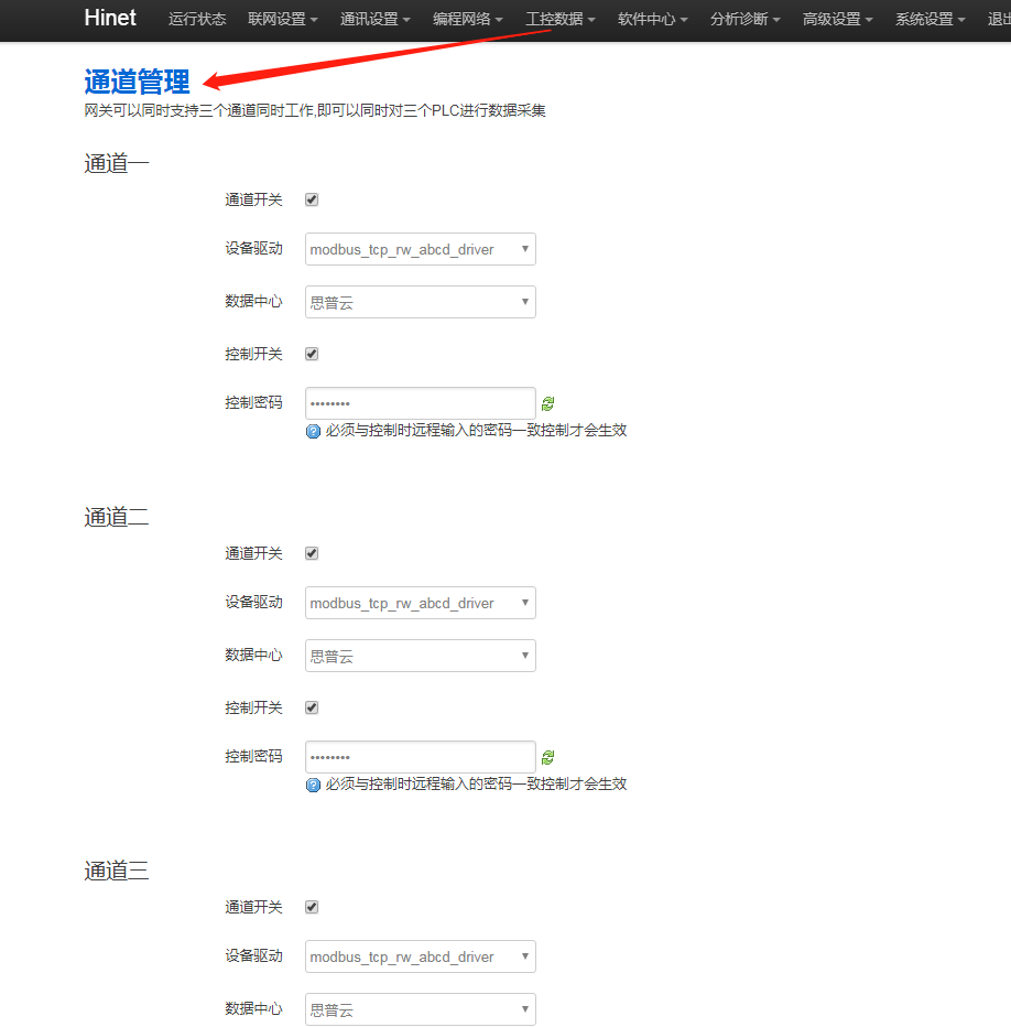 2. 后台通道与平台上所选通道不一致,网关后台“工控数据 - 通道管理”打开的是通道1,思普云平台设备管理处,设备绑定网关时通道选择1。